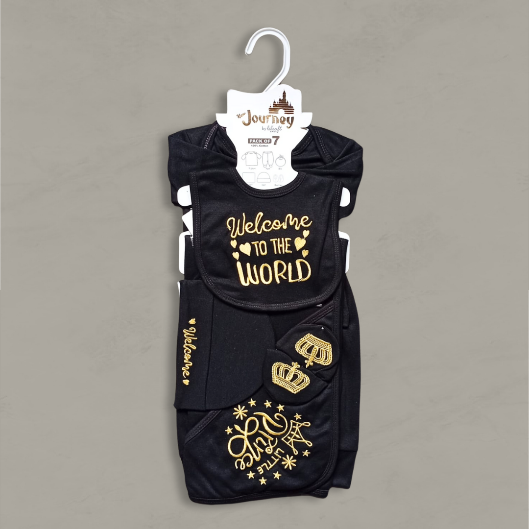 Designed in an elegant black fabric with golden embroidery featuring “Welcome to the World” and “Prince”, this set brings together comfort, softness, and royal charm for your newborn.